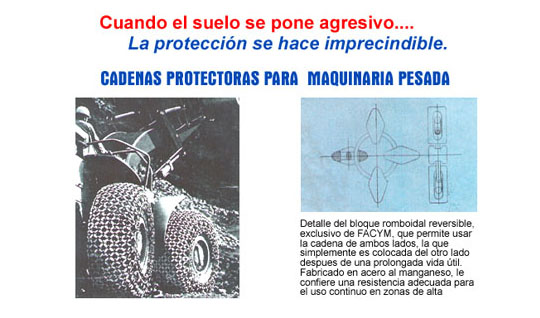 Desarrollamos tambien las cadenas protectoras para la industria minera . Para proteger los rodados de las palas cargadoras, grandes camiones, y otros equipos, cuyos rodados se encuentran expuestos a materiales abrasivos, corrosivos, degradantes, cortantes o de alta temperatura.